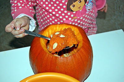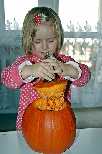 Kiedy już można było zajrzeć do wnętrza, to dalej ogromną robotę odwaliła Natalka. Bardzo cierpliwie wybierała setki pestek i miąższu. Oczywiście pestki poszły do ususzenia i w przyszłym roku sami będziemy dynie hodować. Na potworki rzecz jasna:)