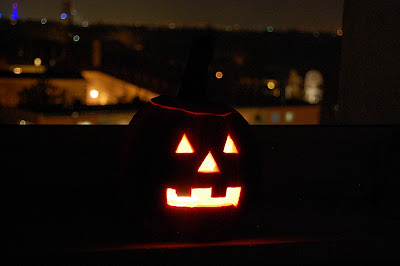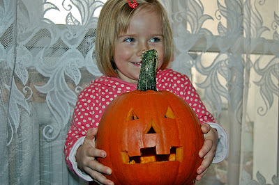 Święto Halloween coraz bardziej zakorzenia się w naszej kulturze. No może kulturze to za mocno powiedziane. Bardziej w naszych zwyczajach, czy tradycjach zapożyczonych zza "wielkiej wody". Ze świętem upiorów i duchów wiąże się "tetranie stwora z korbola". A ponieważ dziecko ponownie chore (już mi się nawet nie chce na ten temat pisać), to aby się w domu czymś zająć, również stworzyliśmy swoją dyniową poczwarkę. Dodam tylko, że był to nasz absolutny debiut. Nigdy w życiu chyba nie trzymałem całej dyni w rękach, nie mówiąc już aby coś w niej dłubać. Piękna nie wyszła, ale ponieważ debiutancka to sprawiła ogromną radość.