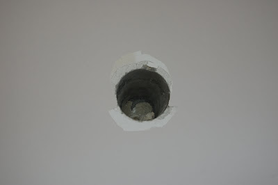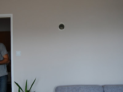 Dziś montowaliśmy zabudowane szafy przesuwne. Nowe mieszkanie, to okazja aby sobie takie zafundować. Poza tym przedpokój duży to aż się prosiło aby przestrzeń zagospodarować. Pracę zleciliśmy profesjoanlnej firmie. Zrobili pomiary, projekty i dziś nastąpił dzień montażu. Wszystko pięknie ładnie, chłopaki pracują od kilku godzin, aż tu nagle wielki huk!!! Okazało się, że w salonie (po drugiej stronie ściany gdzie będzie szafa) wypadł spory klocek ze ściany. Ściana gruba, bo na 15cm, a tutaj wyskakuje piękny walcowaty klocek. Dosłownie jakby ktoś go pięknie wyciął. No i... pozostała dziura. Pech, bo ściany dopiero co wymalowane, salon ukończony a tutaj nagle taka niespodzianka. Ręce opadają.